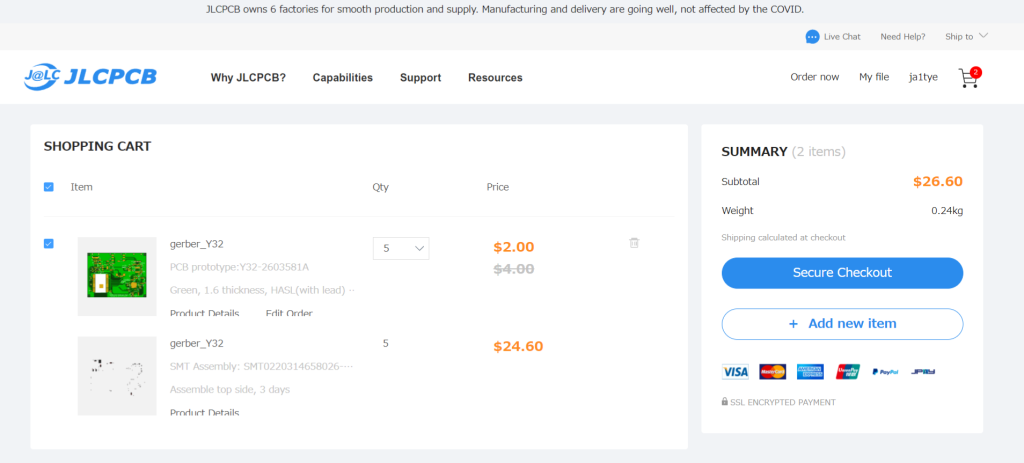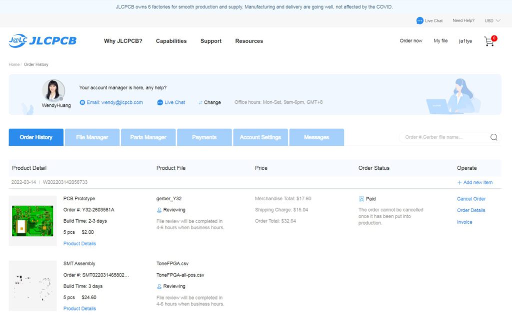 “Pay”を押して支払いが完了すると注文履歴の画面に遷移します。ここまで来たらあとは待っていれば基板が届きます。この画面では製造の進捗状況を確認することもできます。