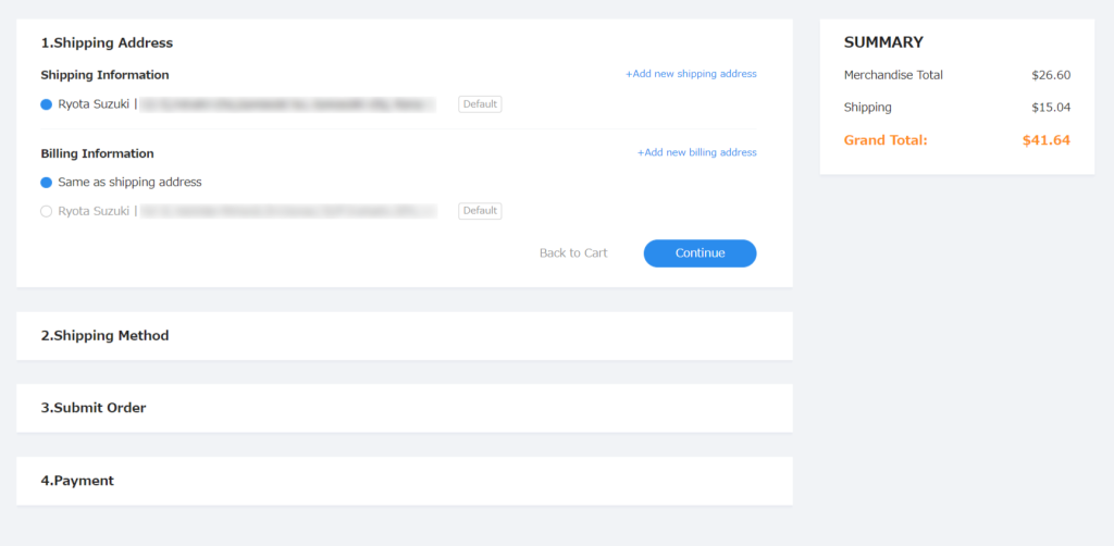 支払い画面ではまず発送先を設定します。新規の場合は”Add new shipping address”を押して住所を入力します。”Billing Information”は領収書の宛先です。特に発送先と変える必要がなければ”Same as shipping address”を選択すればOKです。入力が終わったら”Continue”を押します。