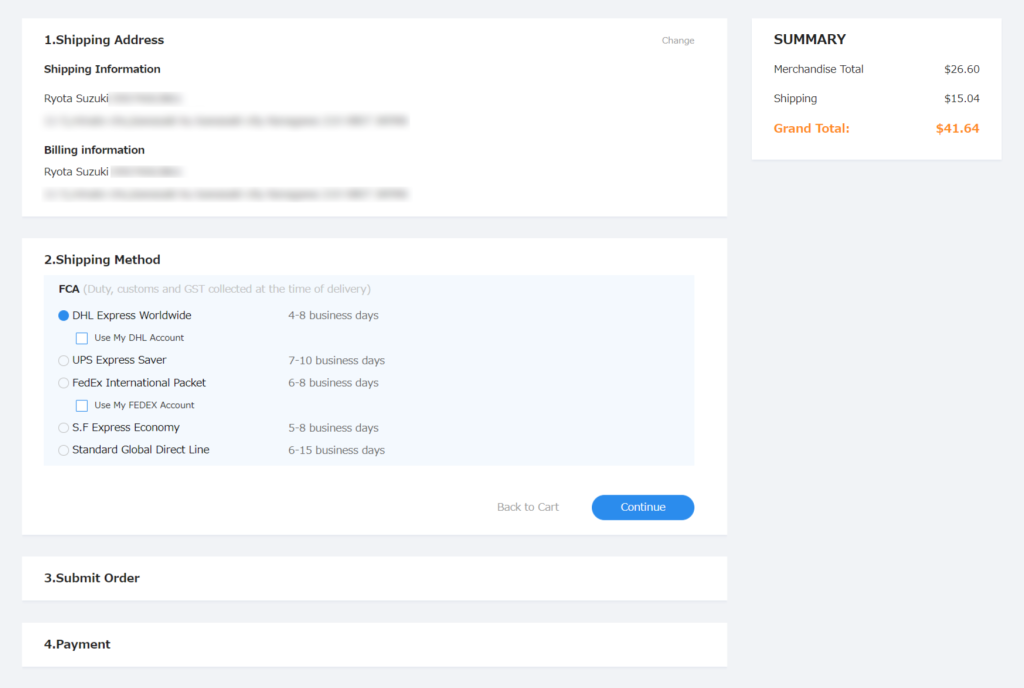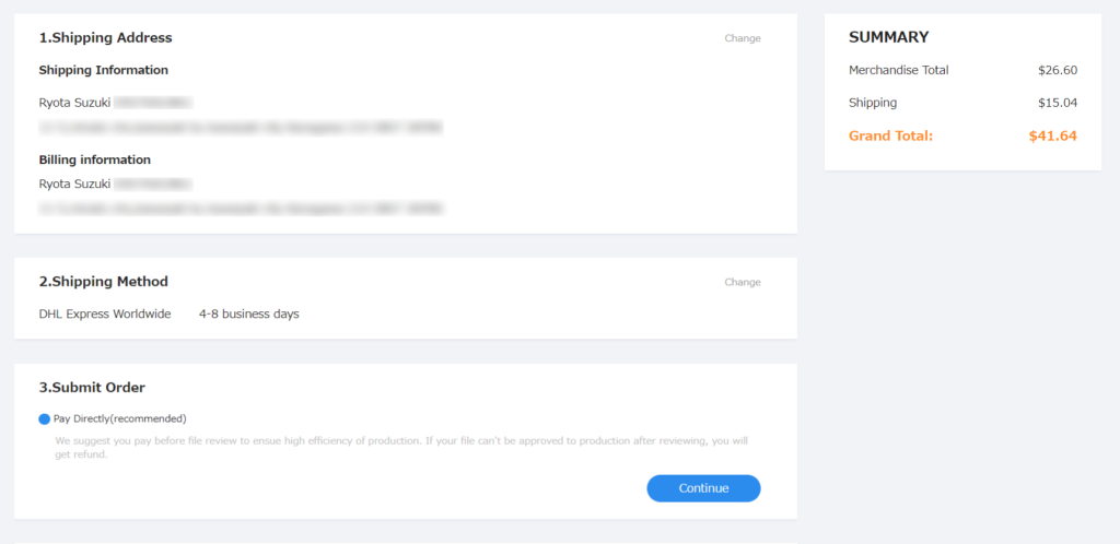 次に発送方法を選択して”Continue”を押して進みます。複数の輸送業者に対応していますが、個人的には表示の通りDHLが一番早く届く印象です。