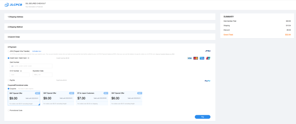 最後に支払い方法を入力します。日本向けのページからGetできるクーポンもこのタイミングで使うことができます。今回は基板製造、部品実装、送料全部込みで41.64ドルのところに、9ドルの割引クーポンを使うことでトータル32.64ドルとなりました。支払い方法の入力とクーポンの選択が終わったら”Pay”を押して注文を確定させます。