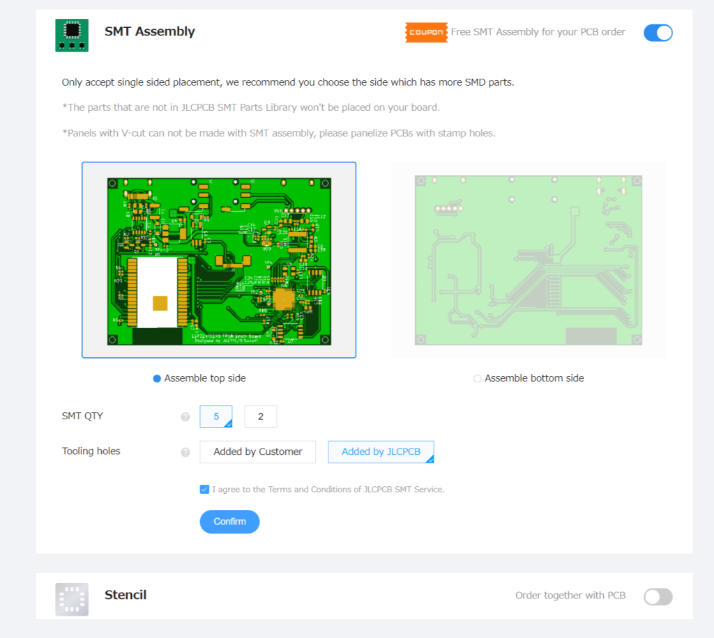 “SMT Assembly”という欄の右上にあるスイッチボタンを押すと、上の画像のような詳細選択画面が出ます。まず最初におもて面とうら面のどちらに部品を実装するかを選択します。