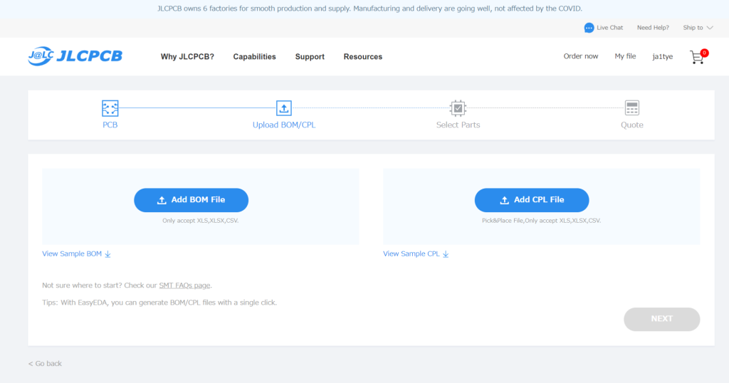 前のページで”Confirm”をクリックすると部品表と部品配置ファイルをアップロードする画面に移動します。”Add BOM File”を押して出てくる画面から部品表を、”Add CPL File”を押して出てくる画面から部品配置ファイルをアップロードします。アップロードが完了した後は画面右下の”NEXT”を押して次に進みます。
