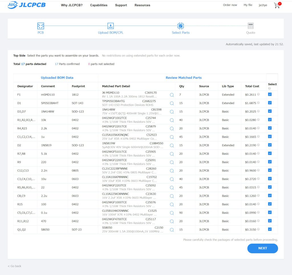 “NEXT”を押すとまず部品表の内容を確認する画面が表示します。特に問題がなければそのまま”NEXT”を押します。もし表示されている部品の一部の実装を取りやめる場合は”Select”欄のチェックを外します。