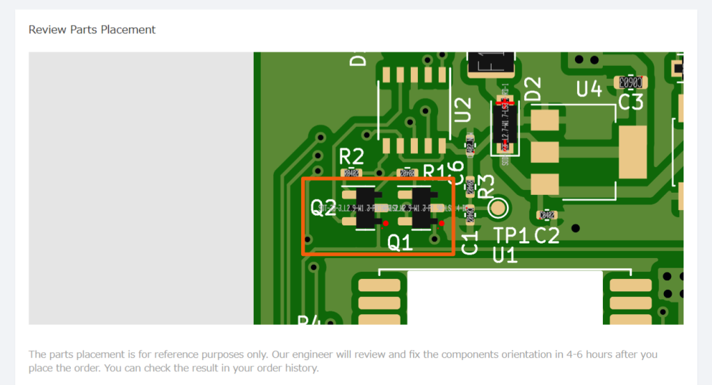 新しい部品配置ファイルをアップロードし、プレビュー画面画面まで再度進んで、部品の取り付け向きが正しくなっていることを確認します。ちなみに、部品実装に関してはJLCPCBのエンジニアがレビューが行われます。そのため、部品実装の向きが基板上のパターンと明らかに合っていない場合などはJLCPCB側でも修正をしてもらえるようですが、時間短縮のためにもこのステップでよく確認して直しておくことをお勧めします。