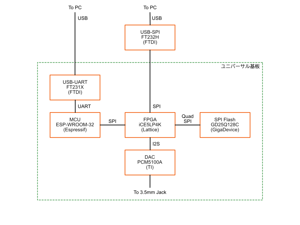 前回はJLCPCBに発注したESP32+FPGAオーディオ基板を組み立てる過程を紹介しました。今回はまず基礎検討に使っていたユニバーサル基板のハードウェア構成を紹介し、その後にJLCPCBで作った基板のハードウェア構成について紹介したいと思います。