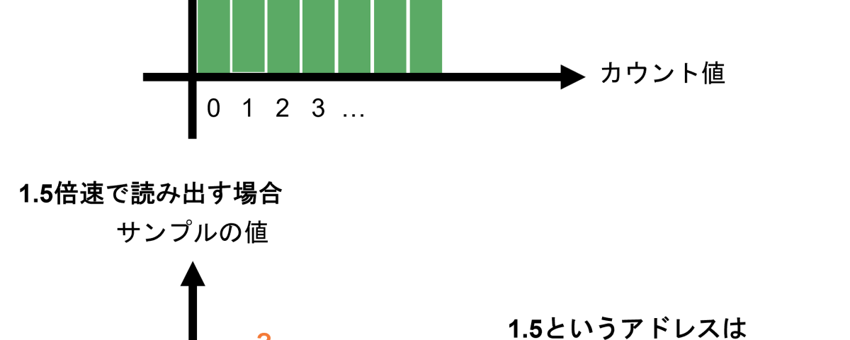 一般的な十二平均律では、ある音とそれより半音高い音の周波数の比率は1:1.059463(2の1/12乗)となります。つまり、サンプルカウンタのカウントアップ速度を1.059463倍にすると、元のカウントアップ速度の時より半音高い音が生成されることになります。1.059463という細かい倍率をきちんとセットできるように、カウント値および1度にカウントアップする量の設定は整数ではなく小数値で持つようにしています。