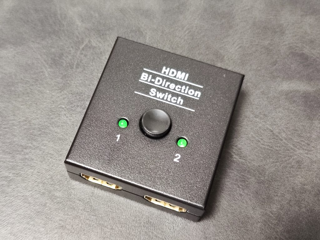 この不便さを解決すべく、Amazonで購入したのがこのHDMI切り替え機です。1000円以下で購入できました。4K60Hzの出力でも特に映像が乱れたりもせず、ワンボタンで入力を切り替えられるのはいいのですが、切り替え機本体にスイッチが付いている都合上、2入力1出力のケーブルが刺さっている本体を手元に出しておく必要があり、これがなかなか邪魔です。