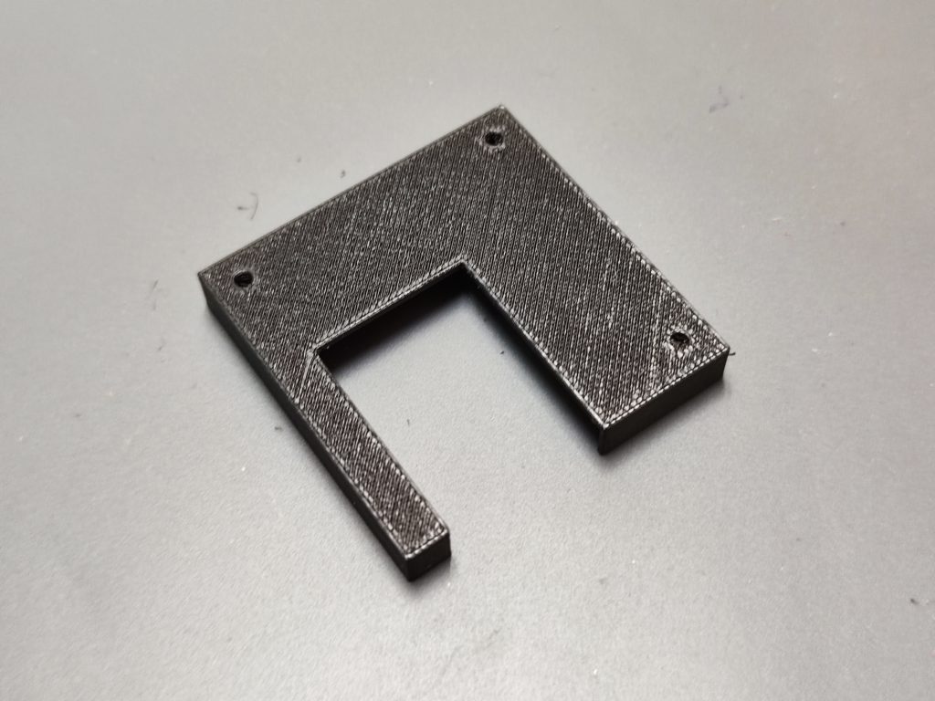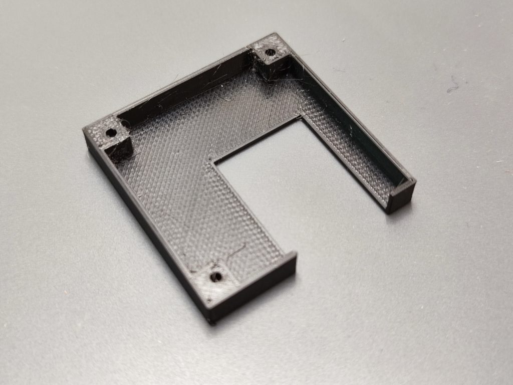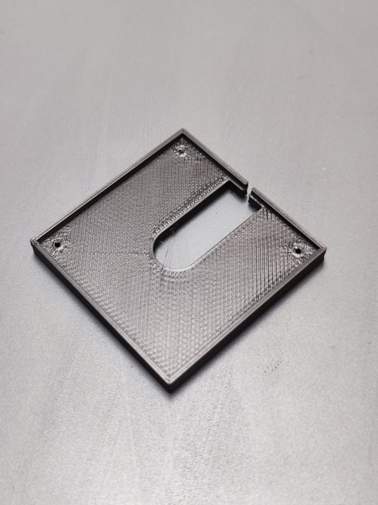 お次はカバー部です。サポート材が必要にならないような形状にするため、ネジの頭が隠れるような設計にはしませんでした。FDM機でプリントした部品は、ヒートベッドに張り付いていた側が白っぽくなることが多いですが、ヒートガンなどで軽くあぶってやると目立たなくなります。