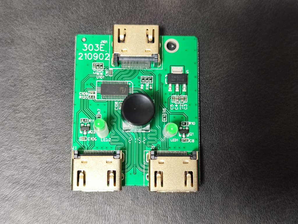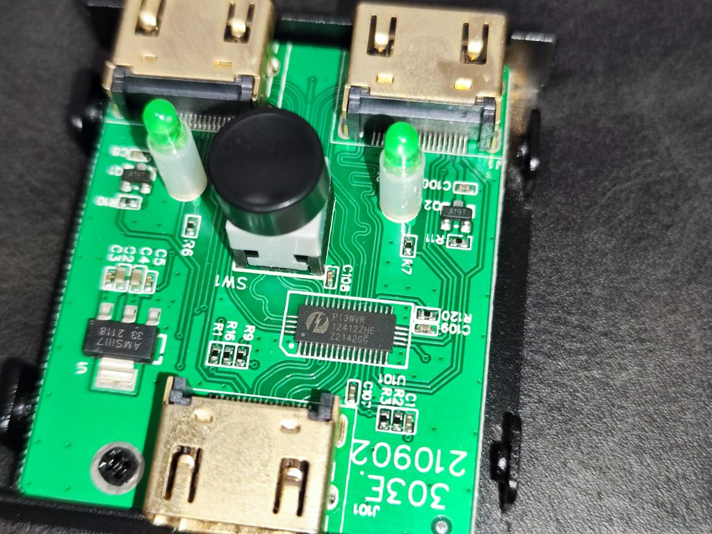 上の写真でボタンの右下にある細長いICはDiodes/Pericom社のPI3WVR12412というアナログスイッチICです。このICはHDMIやDisplayPortの信号を切り替える用途のために設計されたICです。また、基板のパターンも高速信号が通ることを踏まえた等長配線など、配慮がなされていることが分かります。