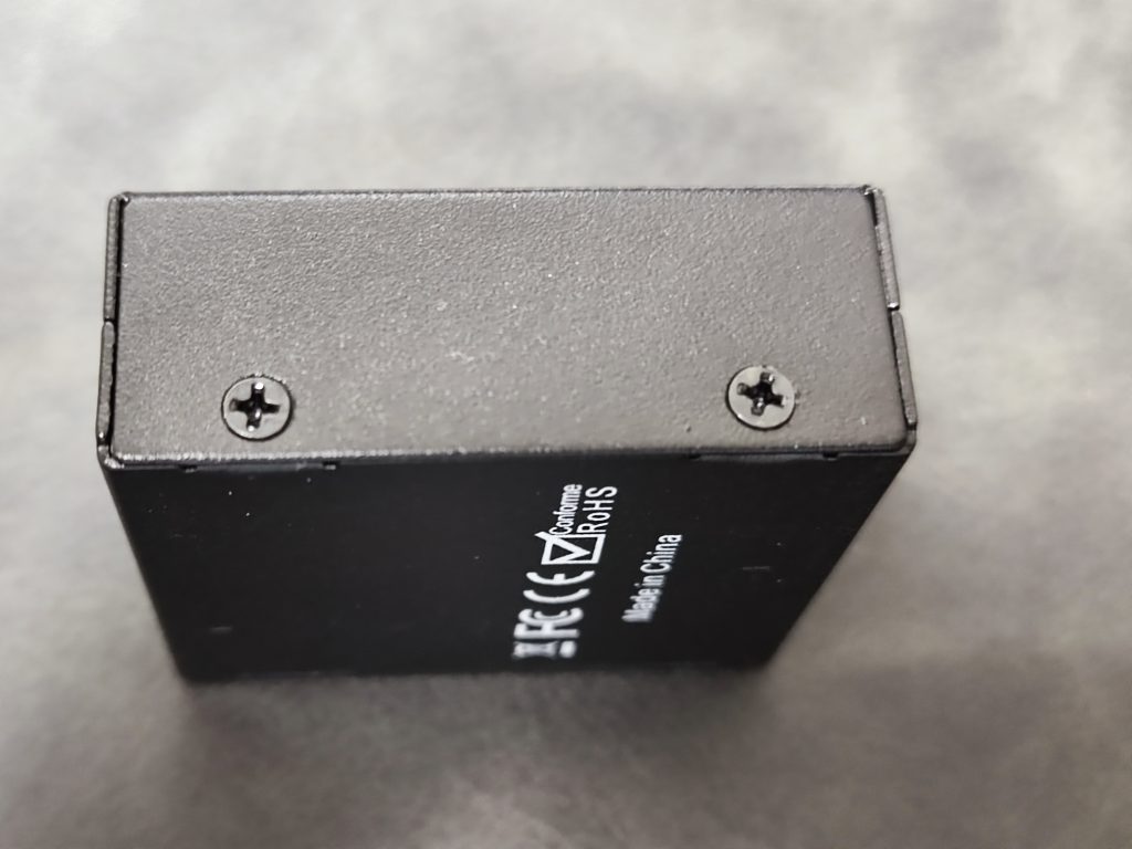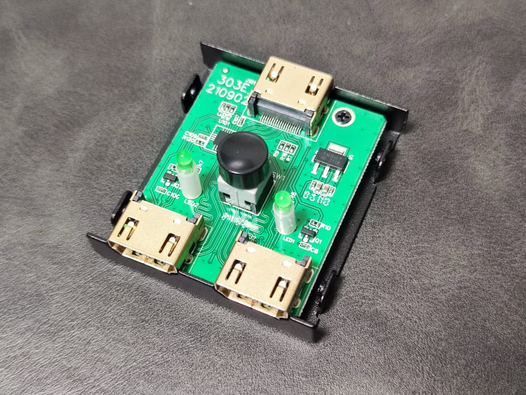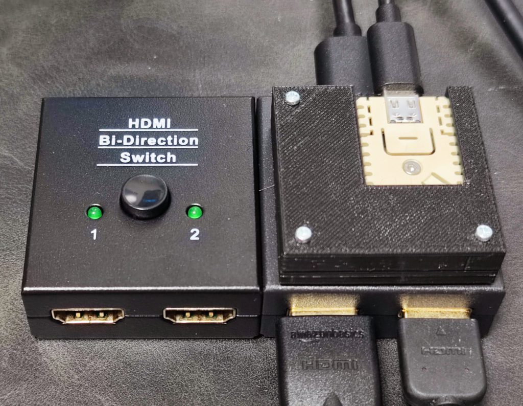 HDMI切り替え機のケースを閉じるとこんな感じです。狙い通り、HDMI切り替え機の上に、ボタンエミュレーター基板がいい感じに収まるようにできました。