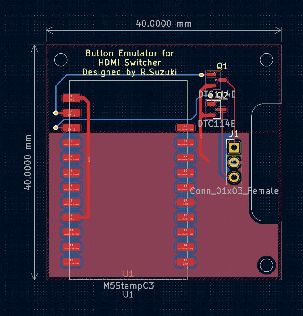 簡単な回路ですが、別件で基板を発注する予定があったので相乗りすべくプリント基板化しました。とはいっても、回路が簡単なので特に凝ったところはありません。元のHDMI切り替え機のケースよりも小さくなるように、基板サイズは40mm角で設計しました。