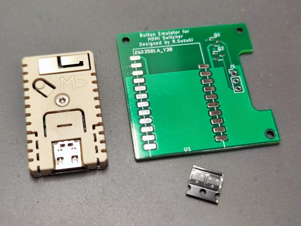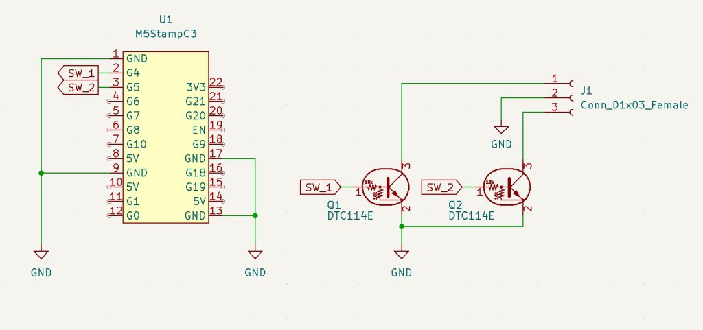 解析の結果から、HDMIの入力を切り替えるためには2つの端子を適切にGNDに落としてやればよいということと、5Vでプルアップされているため3.3V系のGPIOには直接接続できないことが分かっています。そこで、M5Stamp C3Uの先にレベル変換用のデジタルトランジスタを接続してHDMI切り替え用の端子を制御するようにしています。デジタルトランジスタはトランジスタを使う上で必要なベース抵抗やベース・エミッタ間抵抗が内蔵されたトランジスタです。デジタルトランジスタを使うことで、部品数も最大限減らすことができました。