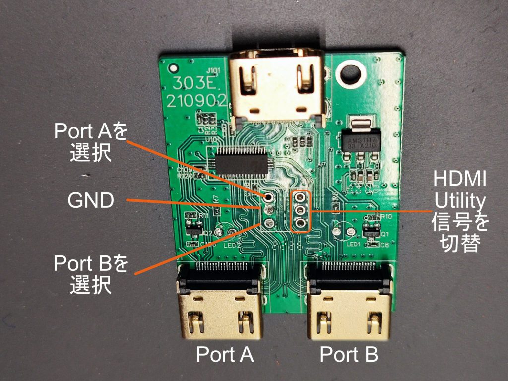一方、反対側の3つの端子はパターンを追いかけていったところ、それぞれのHDMI端子からのUtilityピンの信号を切り替えて、出力側のポートに接続しているだけでした。Utility信号線は初期のHDMI規格では使われておらず、新しめの規格ではイーサネット信号やARC2のために使われている信号線です。今回使われているアナログスイッチICにはUtility信号を切り替える機能がないため、ボタンを使って直接切り替える設計となっているようです。「ARCには対応しません」とAmazonの商品ページには書いてありましたし、イーサネットやARCの用途で使う場合にここを通る信号はそこそこ高速なはずなので、この設計では安定して通信はできない気がします。まあ一応つないでおこうというところでしょうか。今回は実験の結果、Utility信号線を繋がなくても問題ないことを確認しているため、簡略化のためにUtility信号線の切り替えは実装しませんでした。