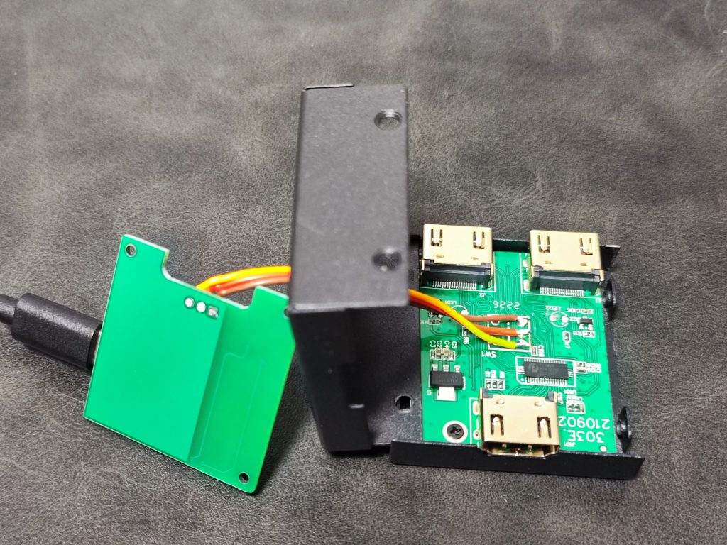 ボタンエミュレーター基板の実装が終わったら、あらかじめボタンとLEDを外しておいたHDMI切り替え機とケーブルで接続します。ケーブルはボタンが出ていた穴を活用して通しました。