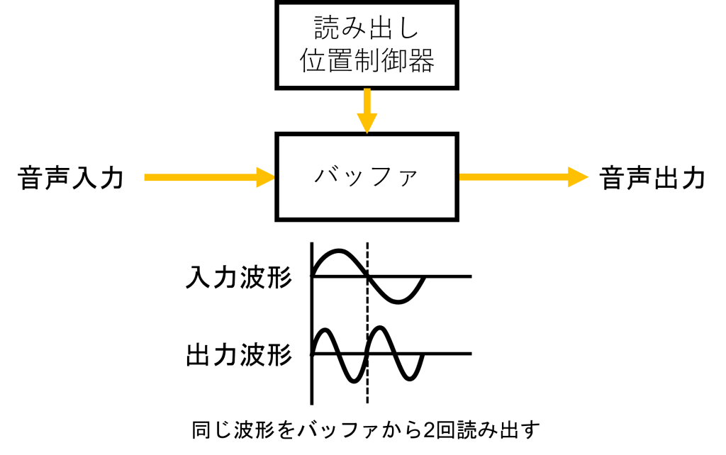 そこで、「それっぽく」つじつまを合わせるために、読み出せるデータがなくなってしまった場合古いデータから再度読み出しを開始します。人間の声の変化の速度は比較的緩やかで、似たような波形の信号が何周期も続くことが多いです。そのため古いデータを持ってきてつぎはぎしても、似たような波形同士のつぎはぎとなり意外とそれっぽく聞こえてしまいます。
