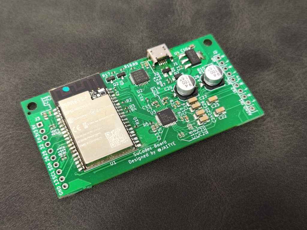 メガホンにボイスチェンジャーを内蔵するにあたり、処理を実装するハードウェアとして、以前製作したESP32とオーディオ用ADC/DACを1つにまとめた基板を使用しました。この基板は大半の部品をJLCPCBのPCBAで実装してもらい、手元に在庫がある部品のみ自前で実装しています。ESP32であれば、本体SRAMだけでも数百KBありますし、この基板で使っているESP32-WROVER-Eを使えば8MBの外付けPSRAMも使えるため、メモリがたくさん必要になりがちなオーディオエフェクトの実装でも安心です。