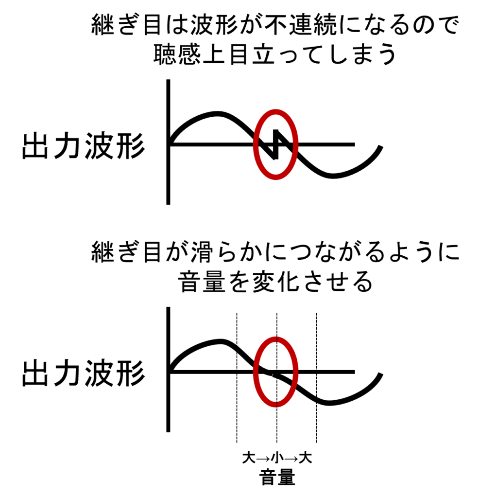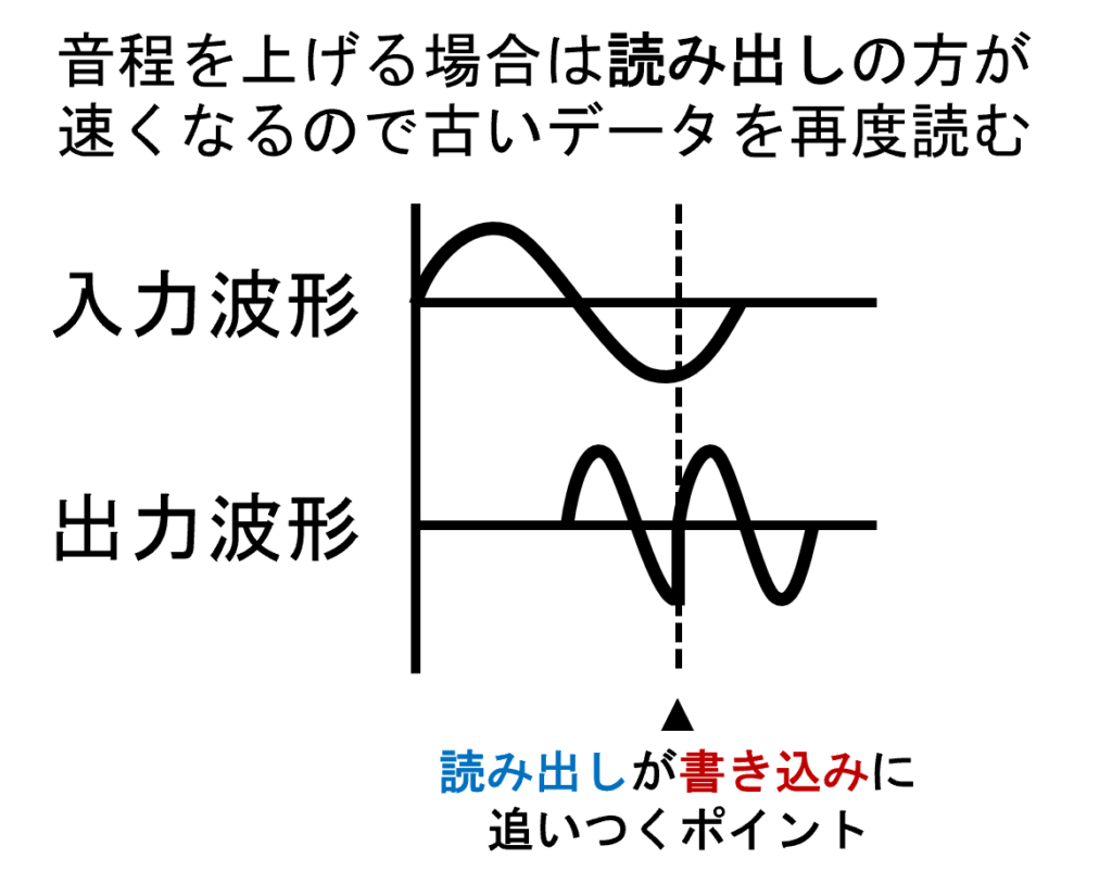 結果として、その瞬間から読み出し側は新しく書かれたデータを読み出すことになり、古いデータから新しいデータに乗り換えたような状態になります。この場合も音程を上げる処理と同様、データののつぎはぎが行われても似たような波形同士のつぎはぎとなるため、それっぽく聞こえてしまうというわけです。