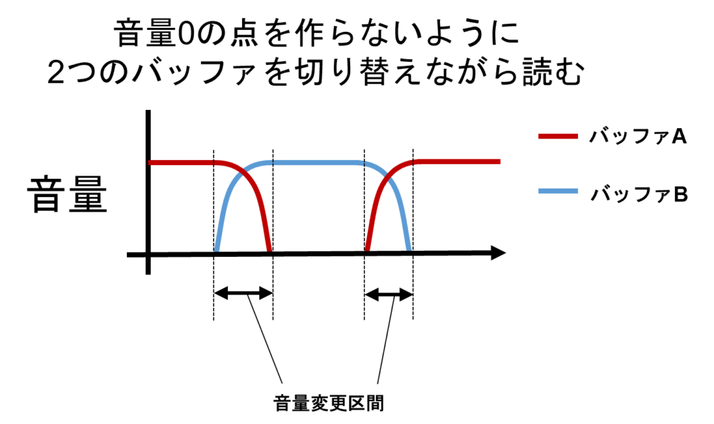この現象への対策として、バッファを2つ用意する方法が考えられます。まず、読み出しタイミングをずらした2つのバッファA,Bを用意します。最初はバッファAからデータを読み出していき、バッファAが「継ぎ目」に差し掛かり音量を下げていく(フェードアウト)タイミングに差し掛かったところで、同時にバッファBからデータを読み出していくようにします。バッファAとBの間の読み出しタイミングのずらし量を十分大きく取っておけば、このとき、バッファBから読み出されるデータは「継ぎ目」ではない場所になります。しかしいきなりバッファBのデータを読み出し始めるとバッファAとBの切り替えポイントが「継ぎ目」になってしまうので、バッファAとは逆に、徐々に音量を上げていく(フェードイン)ようにします。このように、バッファAのフェードアウトとバッファBのフェードインをオーバーラップして行う(クロスフェード)ことで、音量が0になる区間を防ぎながら、データの継ぎ目を目立たなくすることができます。