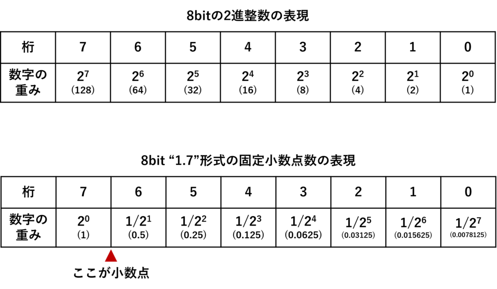 上に通常の8bit符号なし整数と、8bitの”1.7″形式の固定小数点数の表現例を示します。1.7形式というのは、整数部が1bit、小数部が7bitの固定小数点数、という意味です。整数の場合、最下桁(0桁目)が2の0乗、すなわち1の重み、1桁目が2の1乗=2の重み…といったように重みを持ちます。一方で、1.7形式では、最上桁(7桁目)が1の重みで、そこから1/2、1/(2^2)=1/4の重み…というように、各桁が小数の重みを持ちます。たとえば、2進数表記で”1010 0000″は2進整数表現だと、128+32=160となりますが、1.7形式の固定小数点数だと、1+0.25=1.25となります。