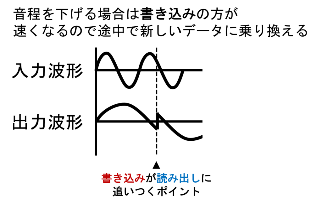 次に音程を低くするケースです。音程を高くするときと同じ要領で、音程を1/2にするためには再生速度を1/2にする必要があります。そうなると、今度は読み出し速度よりも書き込み速度の方が速くなってしまいます。無限にメモリがあればどんどん書き込まれるデータをバッファしていき、後を追ってゆっくりデータを読み出せばいいのですが、実際にはメモリは有限なのでバッファの長さも有限になります。そうすると、バッファが満杯になった時にはすでに書かれているデータを捨てて書き込むスペースを確保するしかありません。