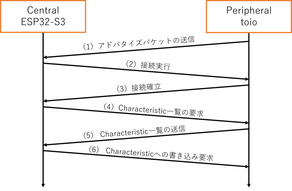 「toio™コア キューブ 技術仕様」のページにある通り、toioはBluetooth Low Energy (BLE)によってスマートフォンなどのデバイスと通信します。BLEの規格では、スマートフォンのような「親機」となるデバイスを”Central”、「子機」となるデバイスを”Peripheral”と呼びます。ESP32-S3にはCentralとPeripheralのどちらも実装することができますが、今回通信相手となるtoioはPeripheralなのでESP32-S3はCentralとして動かすことになります。toioのモーターを動かすまでのCentral(ESP32-S3)とPeripheral(toio)の間の通信の流れを簡単に図示したものが以下となります。