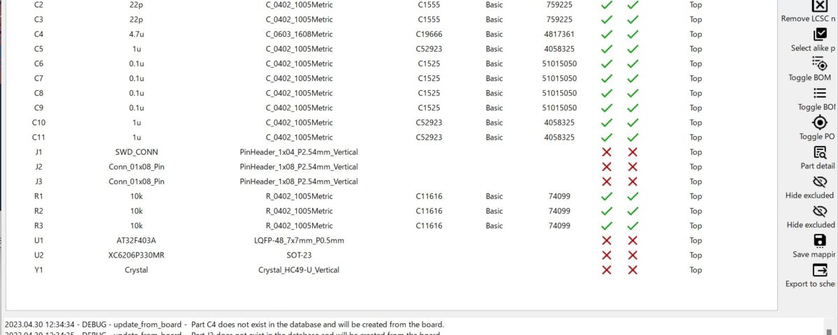さらに、画面右側のボタンやコンテキストメニューから、特定の部品をBOMファイルとPOSファイルへ出力しないようにすることもできます。私のように一部のパーツを手元で実装するため、BOM/POSファイルそれぞれの行をちまちま削除している人には地味にありがたい機能です。