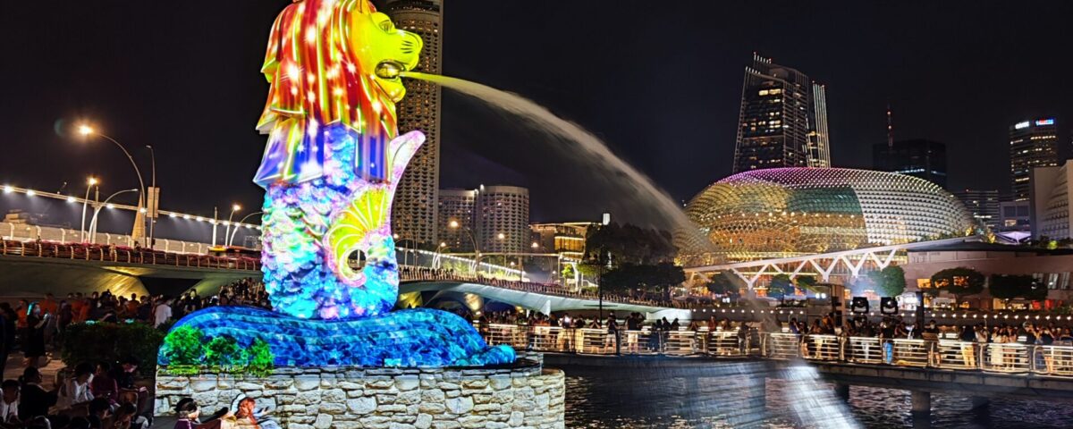シンガポールの観光といえばなにはともあれマーライオンです。今回は夜にマーライオンパークに行ったのですが、がっつり本体にプロジェクションマッピングされていて文字通り光り輝いていました。さすがにこの周辺はそれなりに観光客がいましたが、2023年や2024年に訪問した際の混み具合とは比べ物にならない空き具合ではありました。
