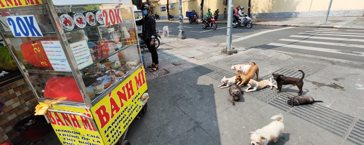 最初の写真を撮った後、隣にあったバインミー屋台でバインミーでも買うかと待っていたら、ワンコが出てくる出てくる…突然街中にわんわんワールドが展開されてしまいました。