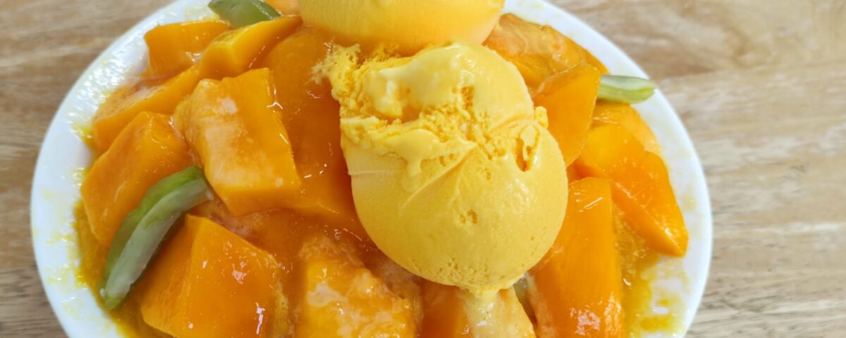さて、肝心のかき氷ですが、「マンゴー無双」という周りの皆さんもオーダーしているであろうメニューをオーダーしました。写真の通り、マンゴーアイス、カットマンゴー、マンゴージュースを凍らせて作ったかき氷と、本当にマンゴー無双です。緑のものもまだ青いマンゴーだそうです。ベタすぎますが、頭がキーンと痛くなったりしながらも、激甘&激ウマのマンゴーかき氷を堪能することができました。これだけでもわざわざ行く価値はあったと思います。