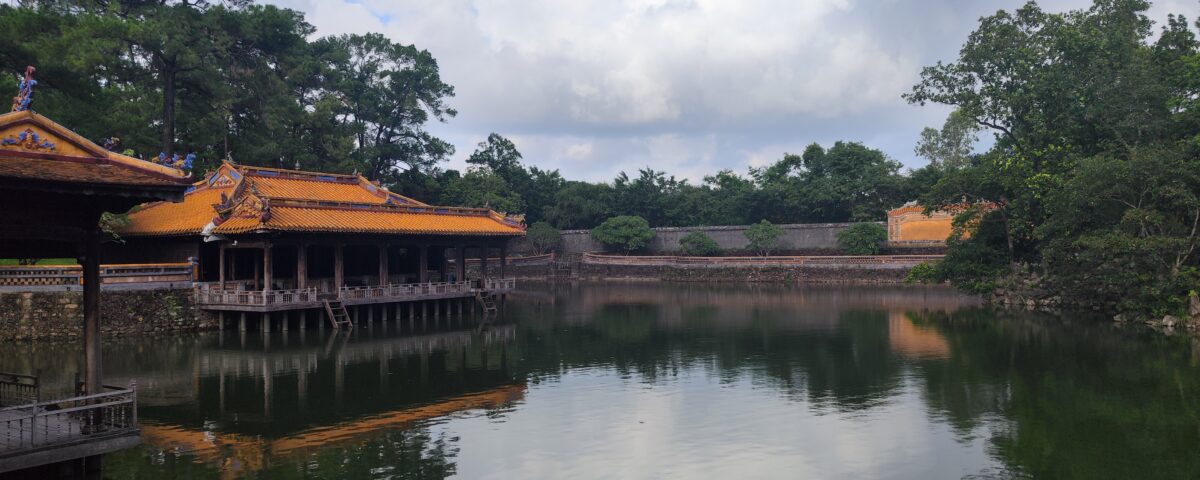 カイディン帝廟の次に向かったのはこちら、グエン朝の第4代皇帝であるトゥドゥック帝の墓廟、トゥドゥック帝廟です。こちらはカイディン帝廟よりはフエの市街地に近い場所にありますが、同じく山の中にある墓廟です。敷地の中には写真の通り大きな湖があり、墓廟というよりは静かな庭園という趣です。実際に、この帝廟はトゥドゥック帝が存命のうちに完成し、離宮として使われていたこともあったそうです。