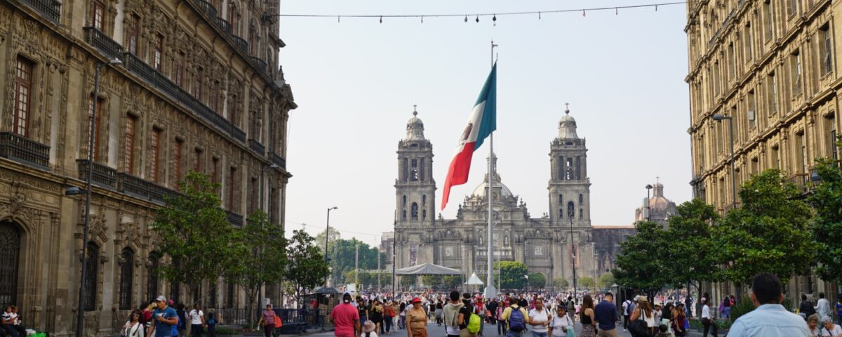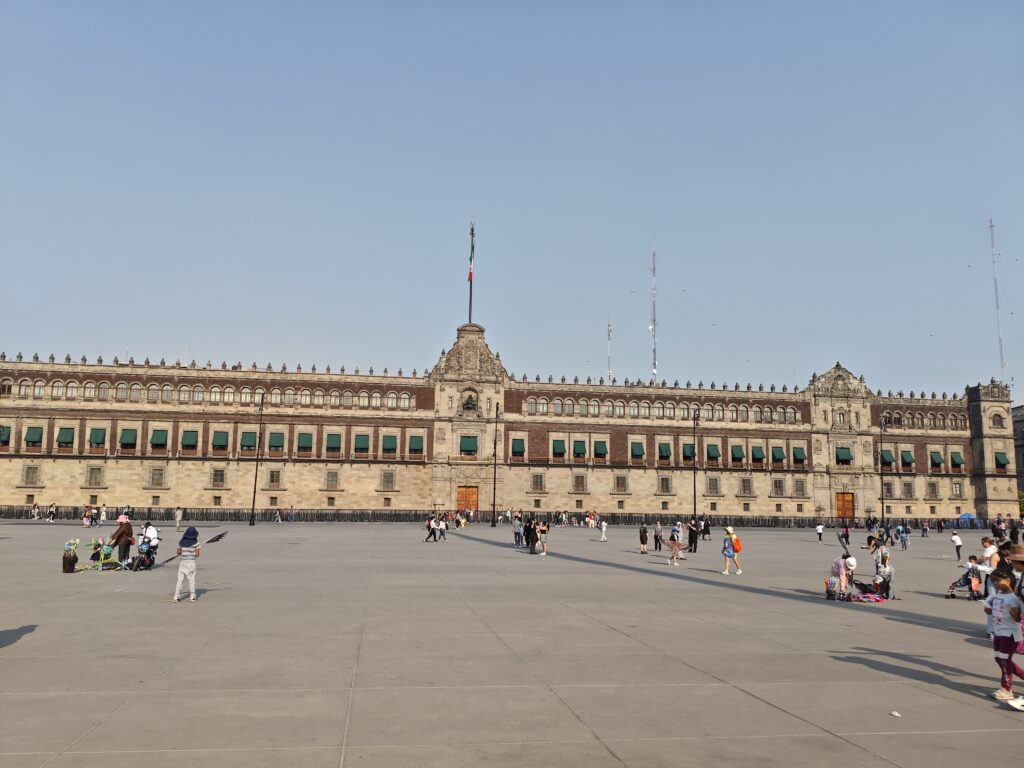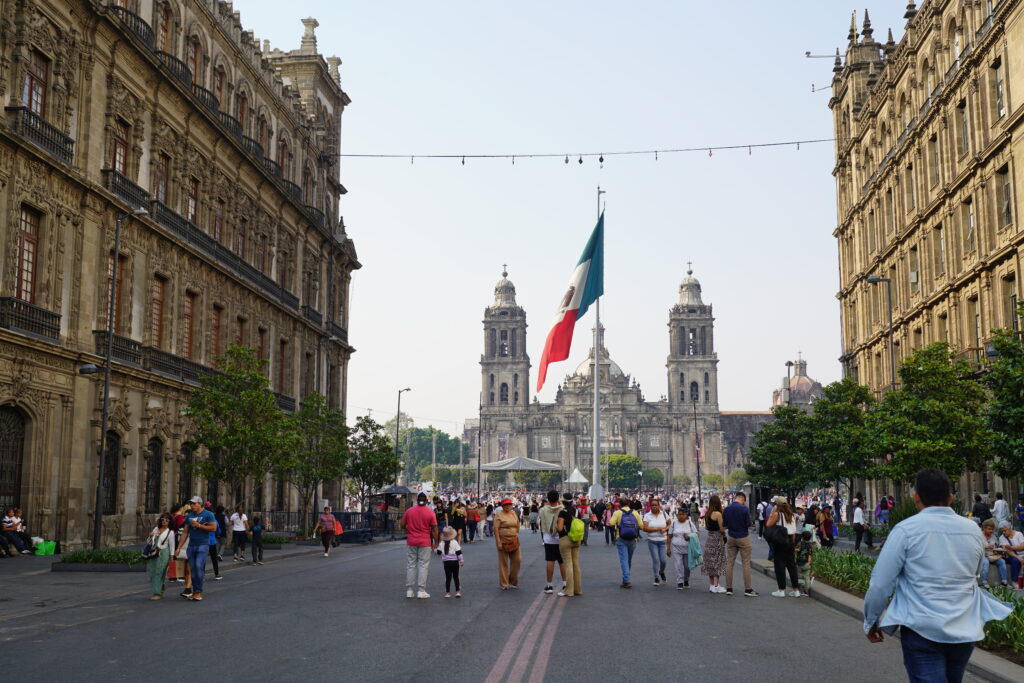 ひとしきり電気街を堪能した後は歩いて先ほどスルーしたメキシコシティ最大の観光地、街の中央広場のソカロへと向かいました。空港からのタクシーの窓からも写真の大きなメキシコ国旗が目に入り、おお、大都会だ!と思ったのですが、歩いて広場に近づいていくと、大きい国旗とおしゃれな街並みにメキシコシティは思った以上に都会だなぁ…と改めて思わされたのでした。