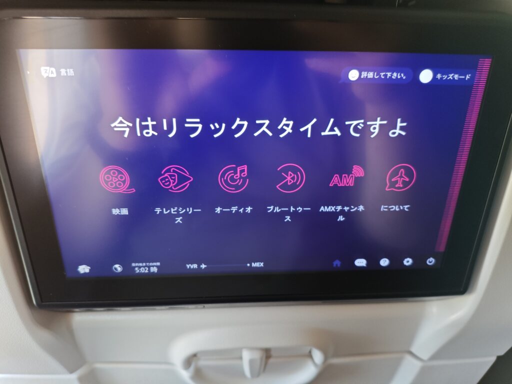 飛行機に乗り込むと座席には新しめの機内エンタメ端末が装備されていました。なんと日本語の表示も用意されていました。「今はリラックスタイムですよ」という、エコノミーの狭めの座席でもリラックスすることを強いてくる表示はなかなかの味わい深さです。