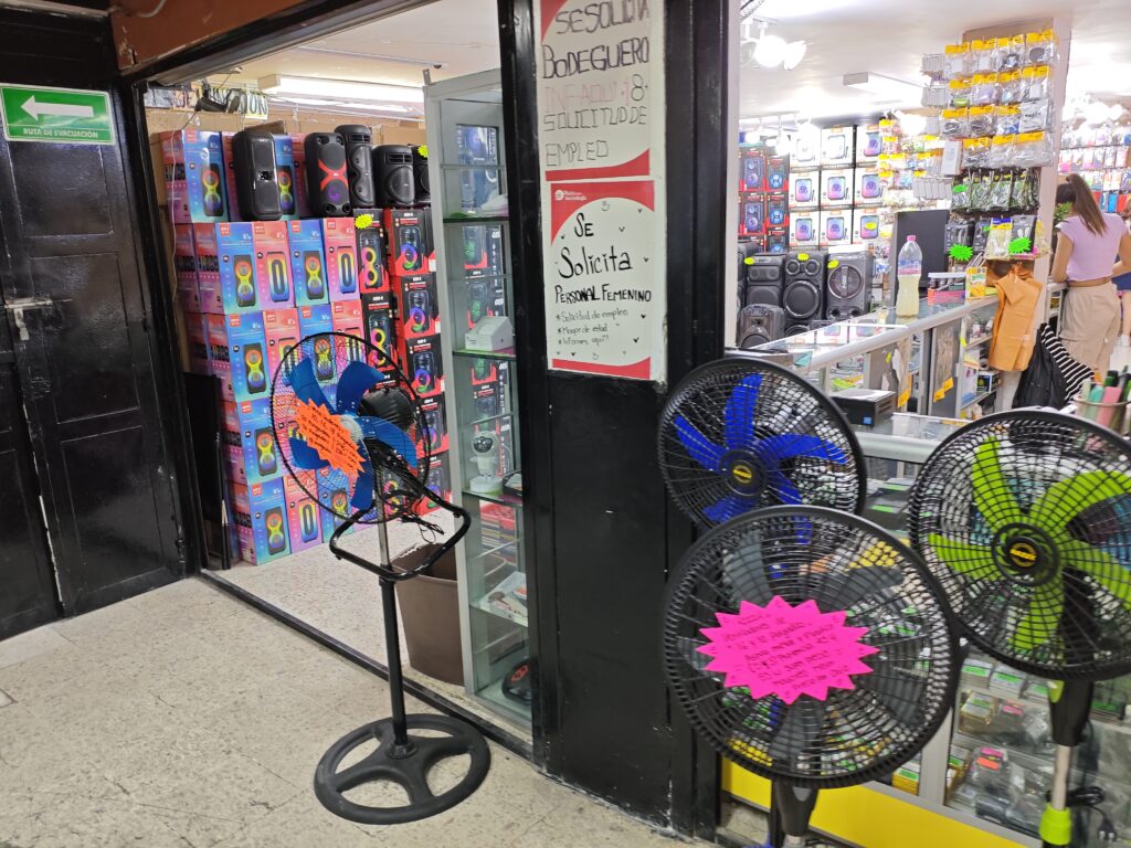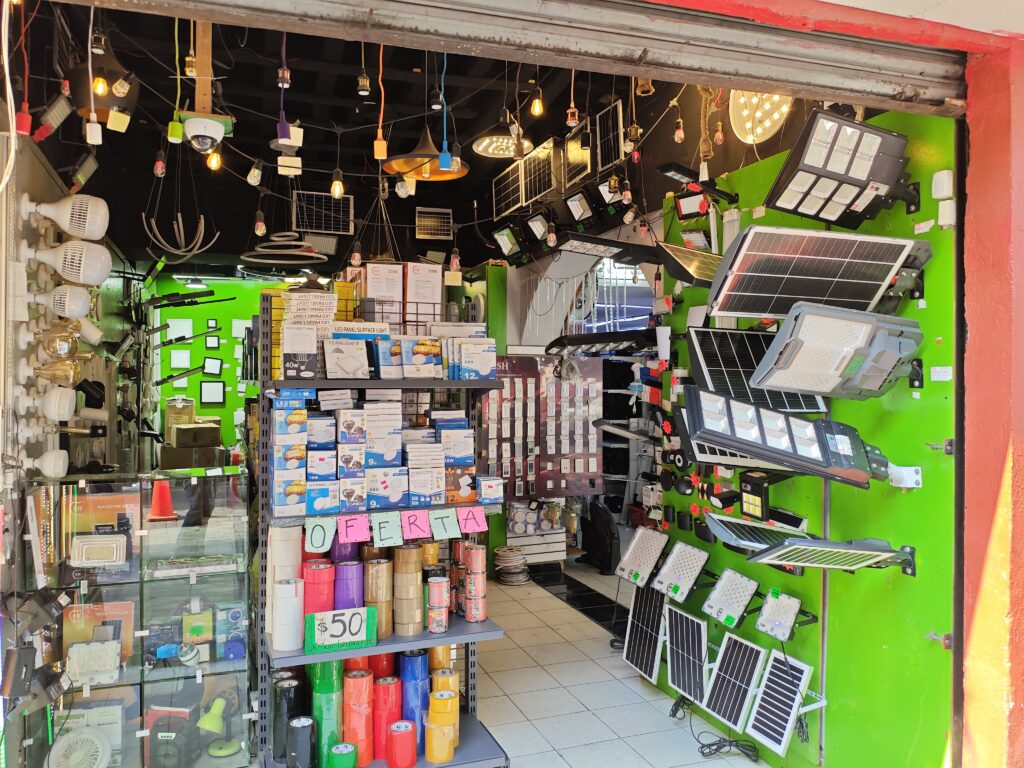 早速お店を覗いていきます。先ほど書いたように通り沿いに何軒もテナントビルが建っているような形態になっているので、道路に面したお店、ビル内の通路を進んだ先のお店と色々あります。ちょっとユニークなのは1枚目の写真のように、ソーラーパネルや屋外照明などの電設関連のお店があったことでしょうか。メキシコの暑い・陽気というベタなステレオタイプから来る期待を裏切らず、大音量の出そうなスピーカーや扇風機を扱うお店もありました。