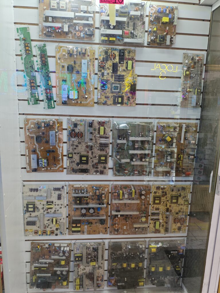 こちらの写真の基板群はおそらく液晶テレビ用の電源基板です。TVリモコンの専門店があったことからもわかりますが、テレビを修理して再利用することがよく行われているのだと推測できます。