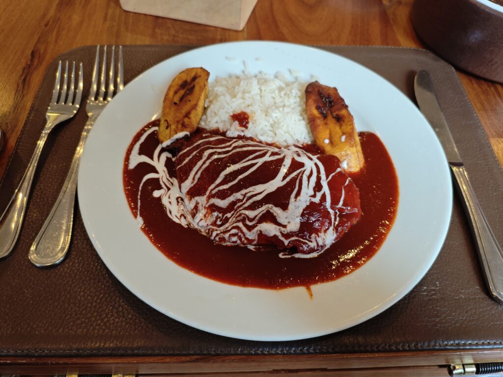 せっかくならばメキシコっぽいものを…ということで、メキシコ風のソースで味付けされたチキンとクラフトビールをオーダーしました。ややフルーティーなチキンのソースの味付けもおいしかったですし、ホクホクのバナナをメインの料理として食べるというのも新鮮な体験でした。もちろんビールもおいしかったです!