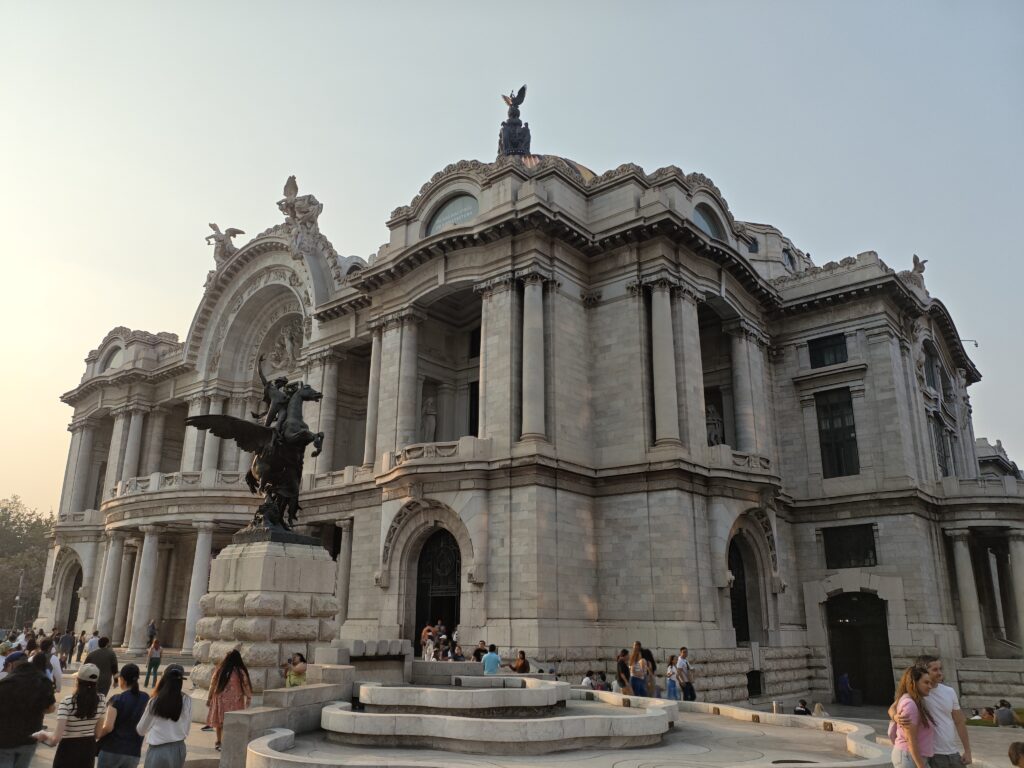 ソカロ周辺を見学した後、レストランでちょっとご飯を食べてから最後にメキシコシティのもう一つの名所ということでベジャス・アルテス宮殿へと向かいました。こちらはオペラハウスとして使われている建物で、内部も一般公開されています。しかし今回は残念ながら時間切れということで、外から眺めるだけとなったのでした。1900年代初頭の建築で、こちらもメトロポリタン大聖堂と同じくヨーロッパのオペラハウスにも負けない威容を誇っています。