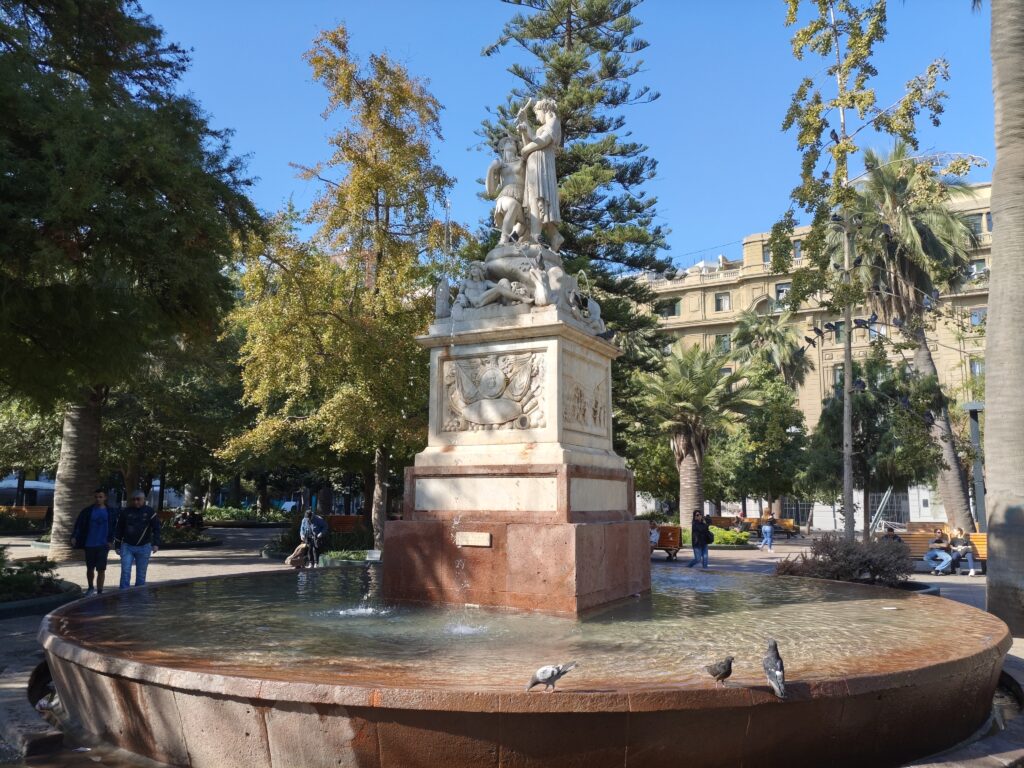 アルマス広場には立派な騎馬像が建っていました。馬にまたがっているのは初代チリ総督のペドロ・デ・バルディビアだそうです。ちなみにその背後の建物はサンティアゴ市庁舎になります。市庁舎に限らず、アルマス広場の周囲はクラシックな建物に囲まれていて、なかなかおしゃれな広場でした。