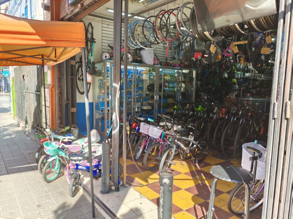 サンディエゴ通りを南に歩いて行くと、電気街が現れる前に自転車ショップが多数並ぶエリアにさしかかりました。写真の通り子供用から大人用まで幅広く扱っている店や、シマノのロゴを掲げたお店など、いくつもお店がありました。チリは同一カテゴリの店が一つの通りに並ぶ文化の国なのかもしれませんね。東京のかっぱ橋道具街ではないですが、お店がそういう風に並んでいる国は結構あるんですよね。