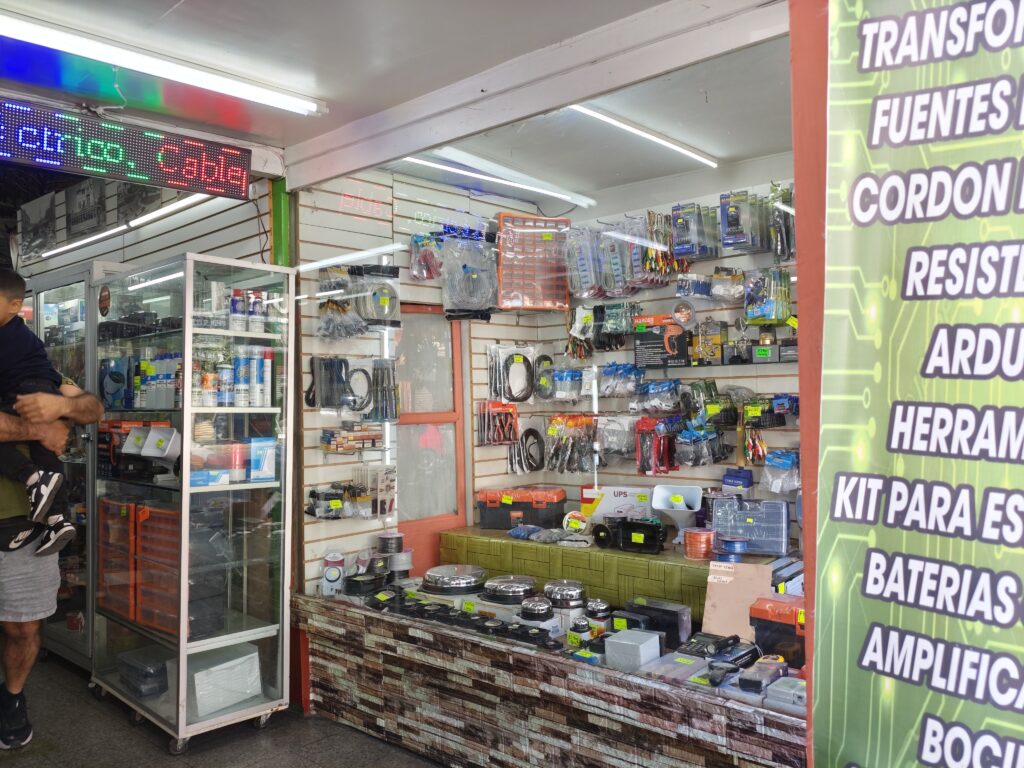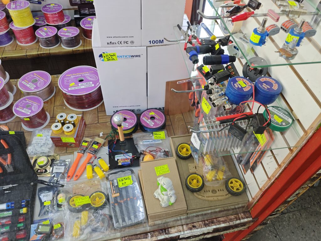 さらに歩いて行くと電子部品店もありました。結構広く、工具から電子部品までいろいろ置いていそうな雰囲気でした。入口にショーウインドウがあるのがなかなかいいですね。