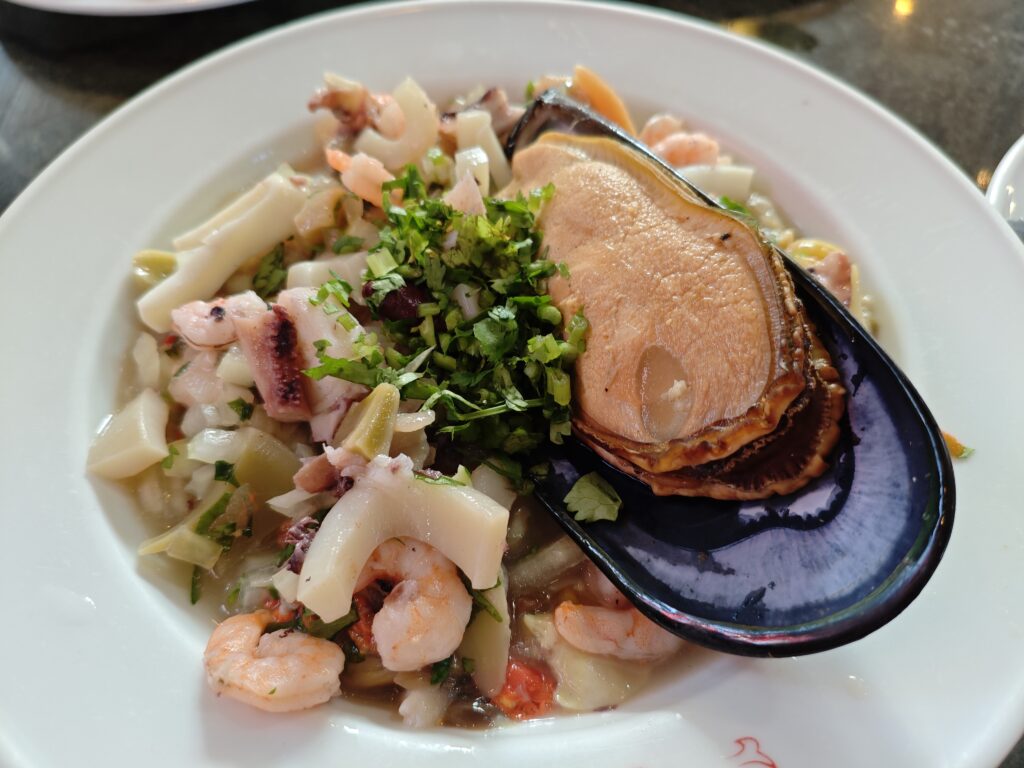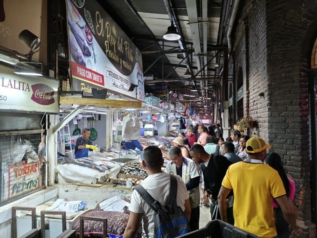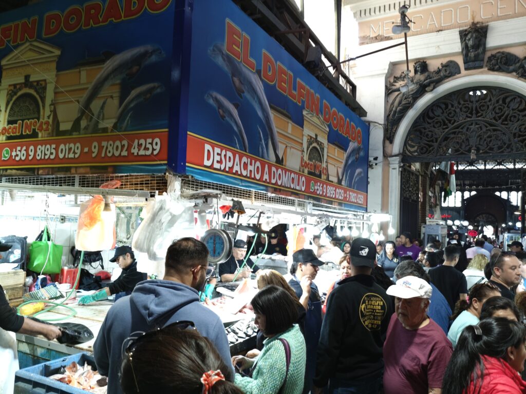 外の風景の写真でもかなりに賑わっているのが分かるかと思いますが、市場の中もかなりの人でごった返していました。さすがは太平洋沿岸の国、海鮮の充実度は目を見張るものがありました。