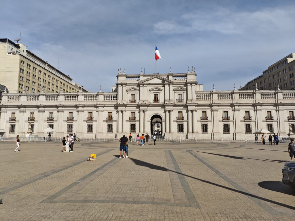 中央市場でお昼ご飯を食べた後は、ホテルのチェックイン時間までもう少し時間をつぶすべく、旧市街の観光スポットの一つ、モネダ宮殿へと向かいました。モネダ宮殿は現在のチリ大統領官邸ですが、元々はスペイン領時代に造幣局として建設された建物です。造幣局にしてはずいぶんと威厳のある建物という気もしますが、だからこそ大統領官邸に転用できたのでしょうね。