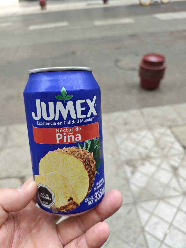 ホテルのすぐそばにはティフアナでもお世話になったコンビニのOXXO(オクソ)があったので水などを買うべく立ち寄りました。バルパライソでもサンティアゴでもレストランに置いてあったのでパイナップルジュースはきっとコンビニでも売っているだろうと考えてジュースの棚も見てみると、やはり缶のパイナップルジュースが売られていました。コーラなどよりはちょっと高いですが、格別においしいので滞在中何度も買ってしまいました。南米に行かれる方はぜひパイナップルジュースを探してみてください!