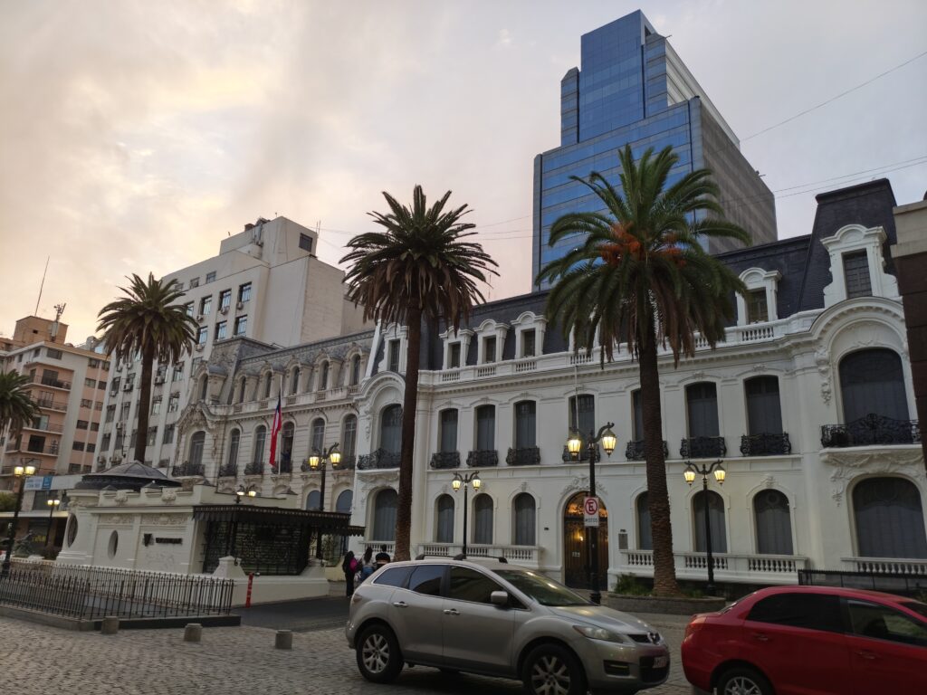 夕方になってまたホテルの周りを散策しました。ここまでにもいくつもヨーロッパ風の建物を紹介していますが、私が泊まったサンティアゴの旧市街エリアは本当にヨーロッパ風の歴史を感じさせる街並みがあちこちに残っていました。1枚目の写真はスベルカソー宮殿という建物です。建てられた1900年代初頭は銀行家のスベルカソー氏の邸宅として使われ、現在はチリ空軍将校クラブの施設として使用されているそうです。2枚目の写真の建物はサンティアゴ市立劇場で、スベルカソー宮殿と道を挟んで向かい合っています。