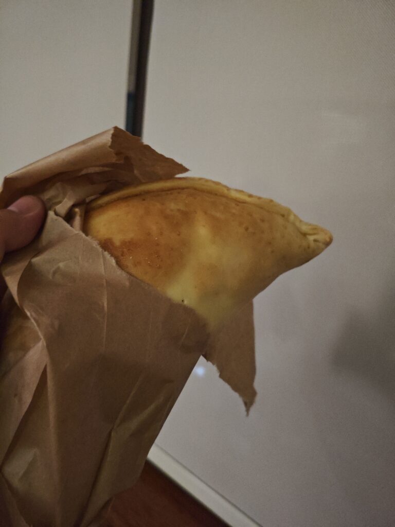 炎天下の中バックパックを背負ったまま電気街調査で小一時間歩き回ったせいかさすがに疲れてしまい、夕方の散策から戻ってうっかり寝て起きたらかなり遅い時間になっていました。正直お昼に食べ過ぎてそこまでお腹が空いていなかったので、近くで夜遅くまでやっていたエンパナーダ屋さんでエンパナーダを買ってきて晩ごはんにしました。
