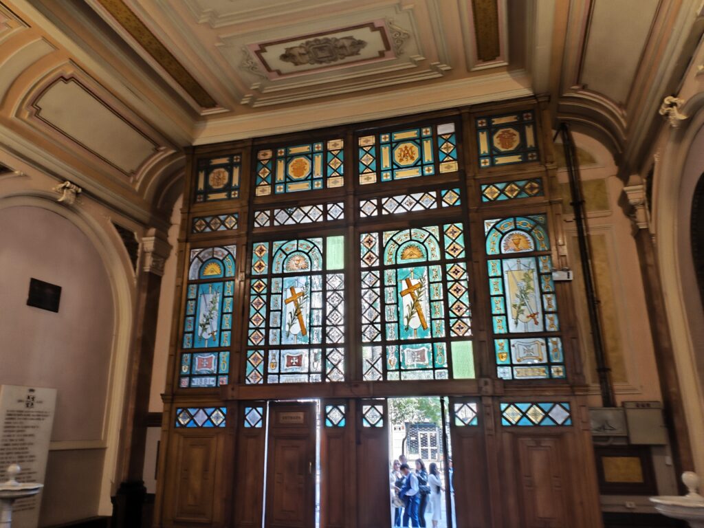 また入り口のステンドグラスも上品な雰囲気でした。教会を見学する際はつい入って正面の祭壇とその周りに目が行きがちですが、意外と背後の入り口部分にあるステンドグラスやパイプオルガン(入り口の上に設置されていたりしますよね)なんかも見どころだったりするんですよね。