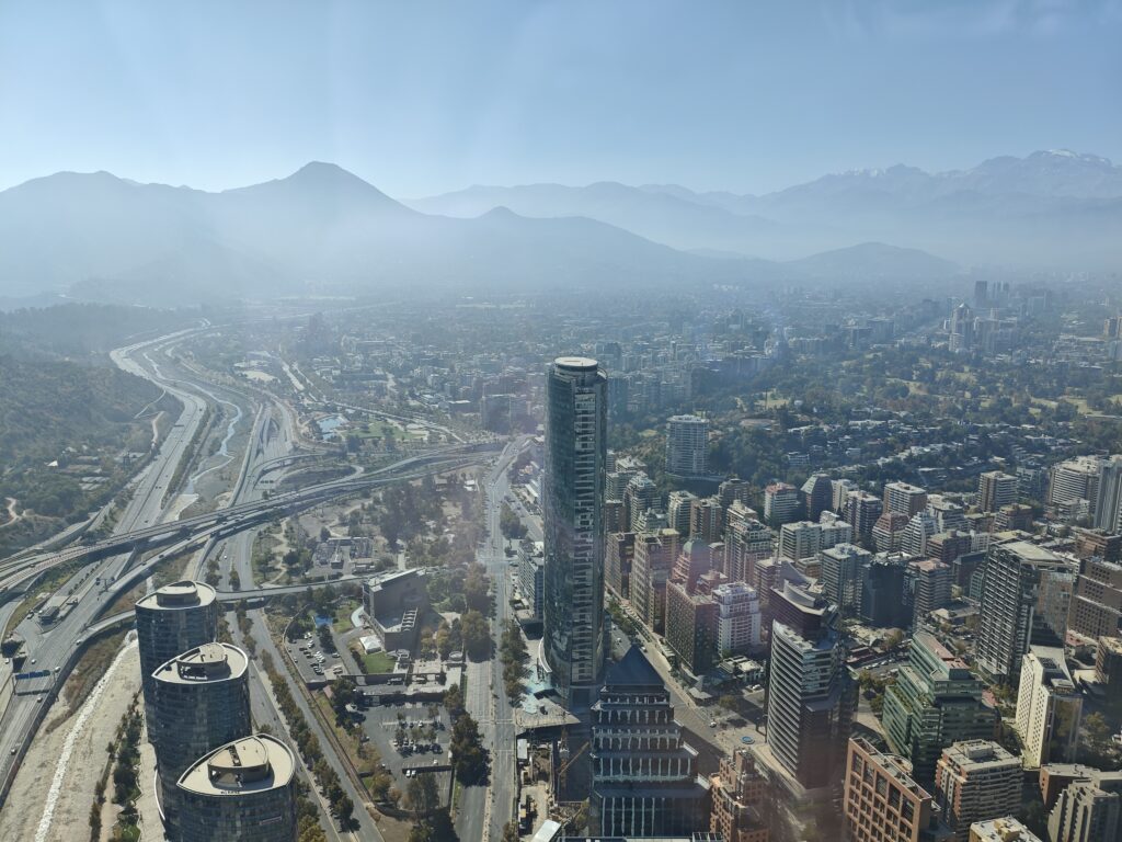 肝心の展望台からの眺めですが、さすがは南米で一番高いビルというだけあって、サンティアゴの市街を眼下に見下ろす、といった感じです。そしてここでもアンデス山脈の壮大さがありありと堪能できたのでした。