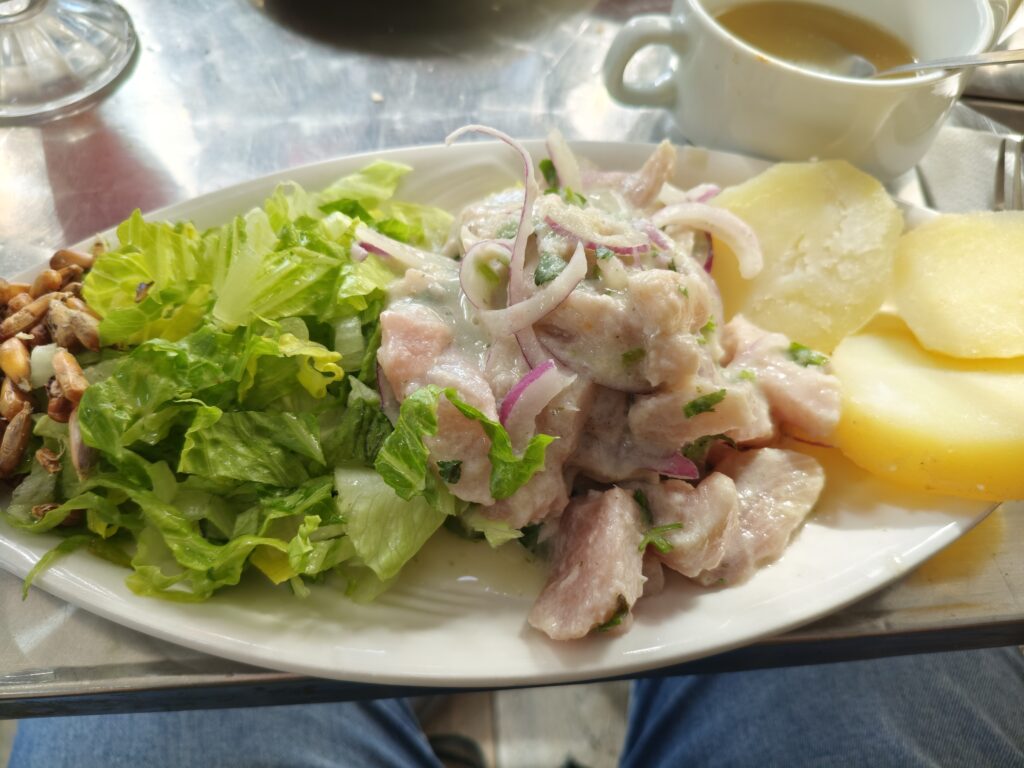 こちらでもバルパライソに続いてパイナップルジュースをオーダーし、メインディッシュはセビーチェ、そしてチリ名物のコングリオのグリルにしました。コングリオ、というのは3枚目の写真のシーフードクリームソースの下に隠れている白身魚で、アシロという魚の仲間です。チリ周辺の深海に棲む魚で、ぷりっと弾力がありおいしい白身でソースともなかなかマッチしていました。