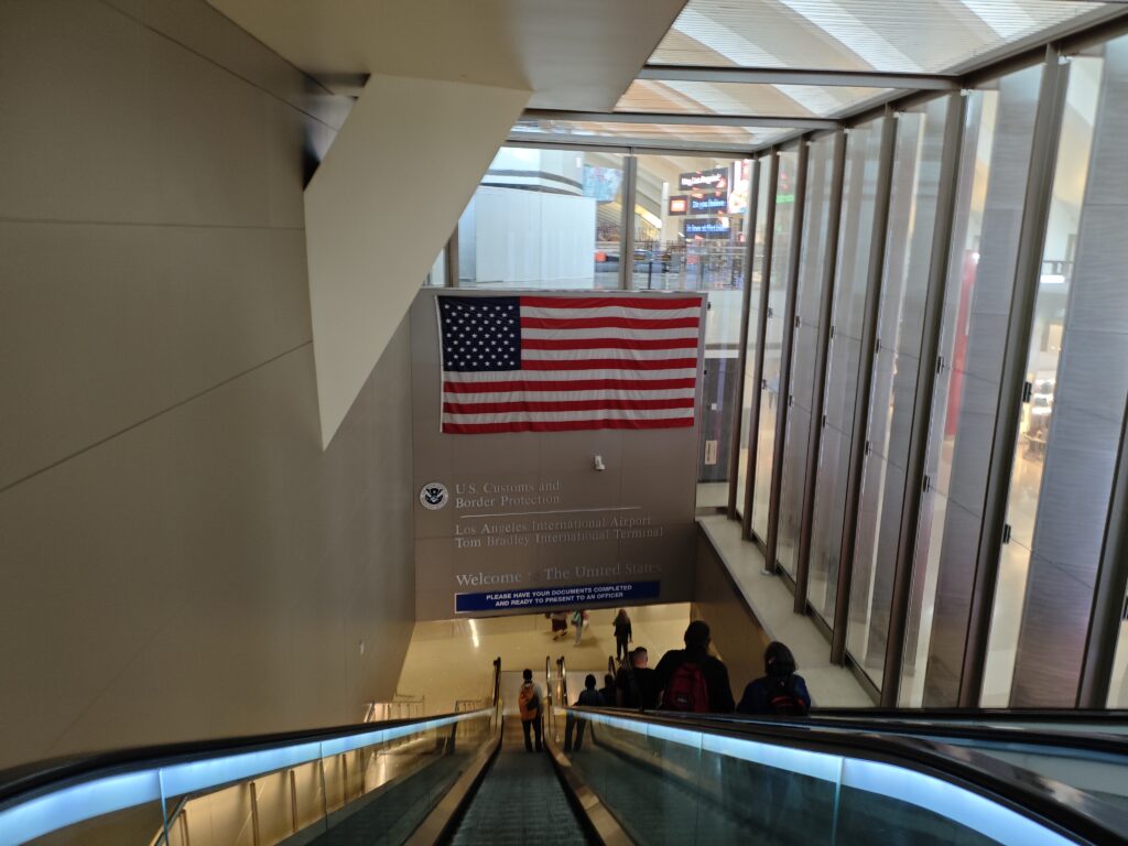 長い11時間のフライトを経て、帰りの乗り継ぎ地・ロサンゼルス空港に到着しました。この時はトランプ大統領が「カナダを51番目の州に!」と言い出した頃だったので、入国審査へと向かうところで見えてきたアメリカ合衆国旗を見て「しれっと星が51個になってはいないだろうな…」というようなことを思ってしまったりしたのでした。