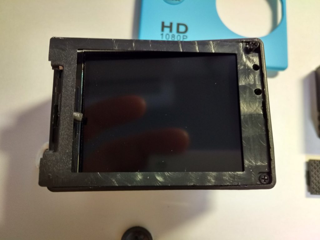 分解を始めるにあたって,まず最初に電池を底部から取り外し,フロントパネルも取り外しました.フロントパネルについてはこのアクションカムを購入したお店で,カラーバリエーションを変更するために手でフロントパネルを適当に付け外ししていたのを見ていたので,簡単に取り外せるだろうと思っていましたが,予想通りちょっとこじれば簡単に外れるようになっていました.