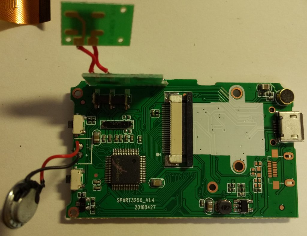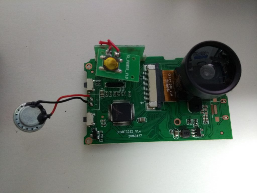 プラスチックのフレーム部品と基板を接合しているネジを外すと,基板とレンズユニットだけを取り出すことができました.左端の銀色の部品はスピーカーです.メイン基板には”SPORT325X_V1.4 20160427″とあります.ちなみに電源ボタン基板には”S1_POWER_V1.0″,録画開始ボタン基板には”SAX_OK_V1.3″とありました.